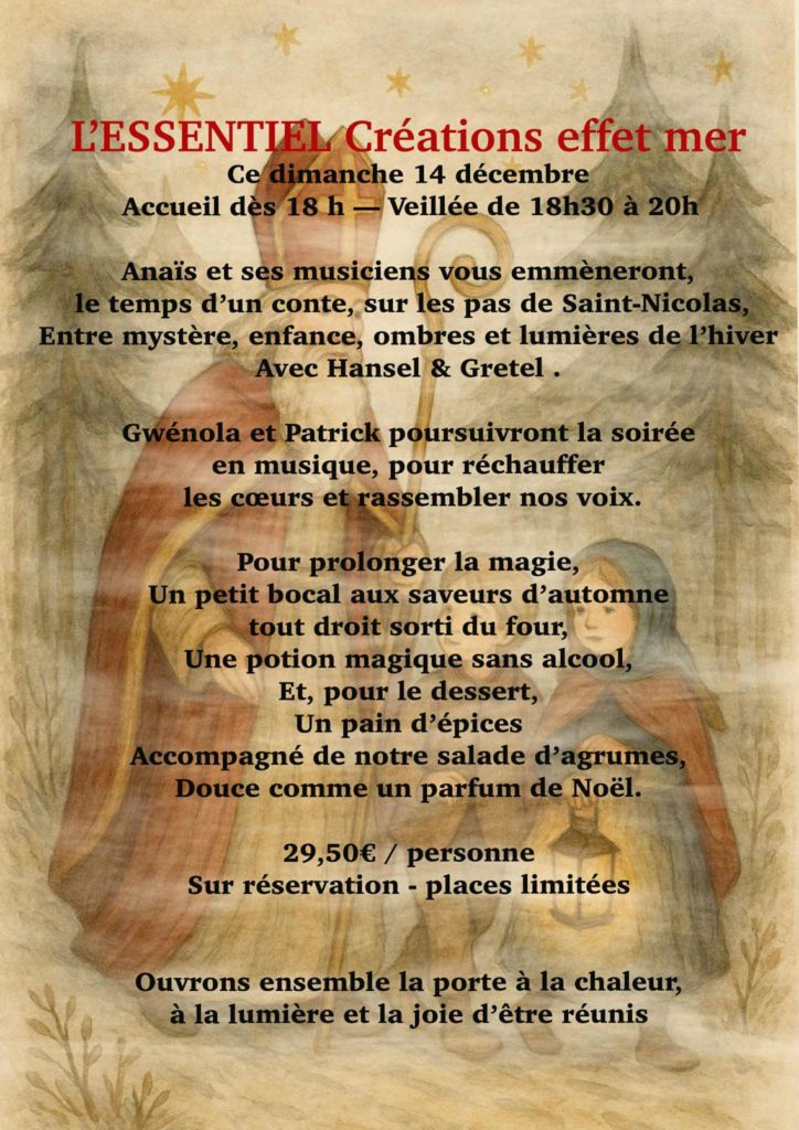 Lors de la célébration de la Saint-Nicolas, fête que je ne rate jamais et que mes amis insulaires connaissent désormais par coeur, évidemment les bredele et les mannele sont de la partie, avec vin et chocolat chaud, comme en décembre 2020, dans le merveilleux bistrot de Nathalie Goupillière, L’Essentiel Création, effet-mer.